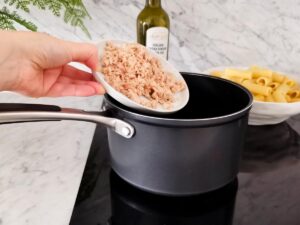 - Proceed by adding your tuna and mix it in with the garlic and oil so everything gets more aromatic.