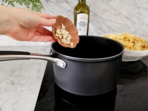 - Press the garlic and add it to your empty pasta pot. Add a generous drizzle of Belmorso EVOO and let the garlic sauté.