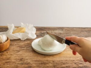 - Slice your burrata into smaller pieces, but first cut it into half and enjoy looking at its creaminess for just a moment.