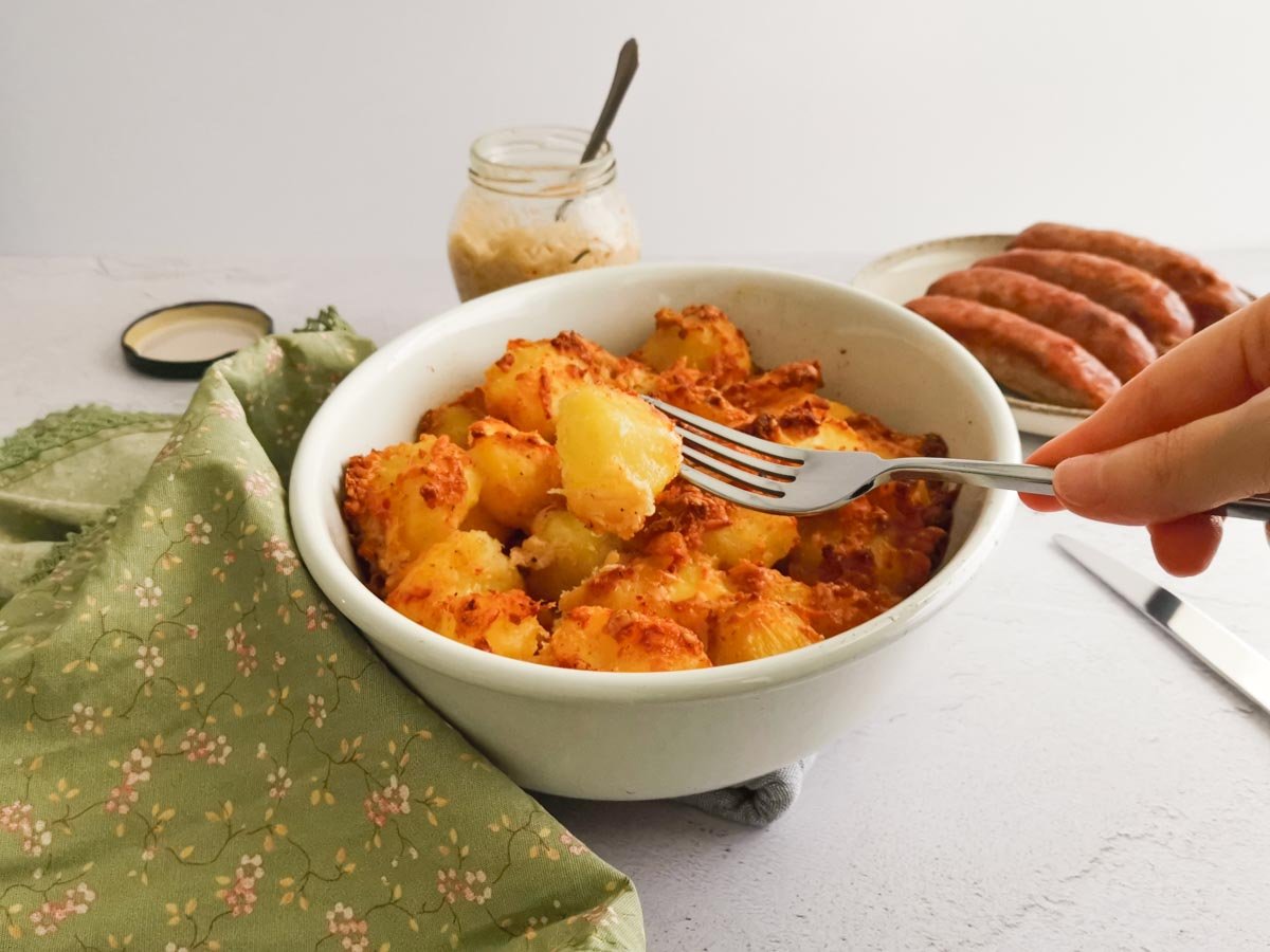 Potatoes and sausages is a match made in heaven independently of what’s your nationality. This is why we suggest serving your roasted cheese garlic potatoes with sausages.