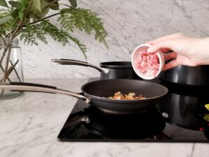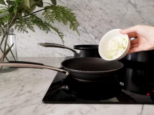 - Add that to a pan, drizzle with Belmorso EVOO, and sauté for a couple of minutes.