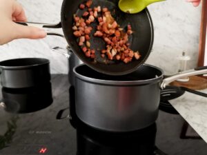 - Transfer the pasta back to the same pot, and add the sautéed bacon and spring onions.