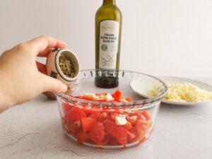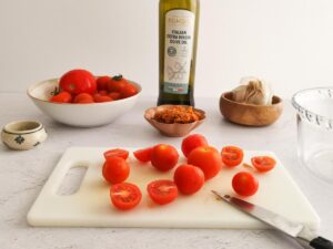 Cherry tomatoes are also perfect to make this starter because they are small, and you simply need to wash them and cut them in half or in four.