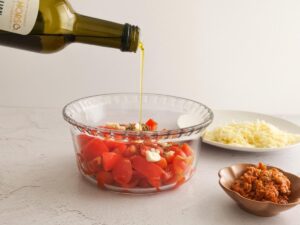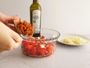 - Add the Belmorso Cannonata and mix well. At this point, you can refrigerate the mixture for a few hours and come back later, or you can go ahead and assemble your bruschetta.