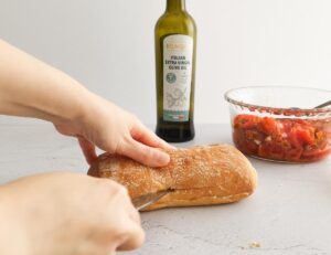 - When you are ready to make it, slice the ciabatta bread in half. I am using only three slices, but you can use all four. If you do, you might have to add more tomatoes.
