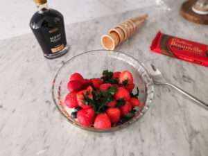 - Once you are ready to serve your balsamic fruit salad do this:Use a dessert bowl to add the fruit.Top with the vanilla ice cream. We are using an Italian fior di latte flavour.Drizzle some balsamic vinegar on top of the ice cream.Add your cone or wafer biscuits.Grate your dark chocolate on top, on melt it and drizzle it, if you prefer.Serve immediately, before the ice cream starts melting.