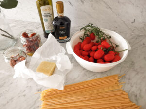 For our balsamic pesto pasta, we are choosing a slightly thicker option than spaghetti – linguine.