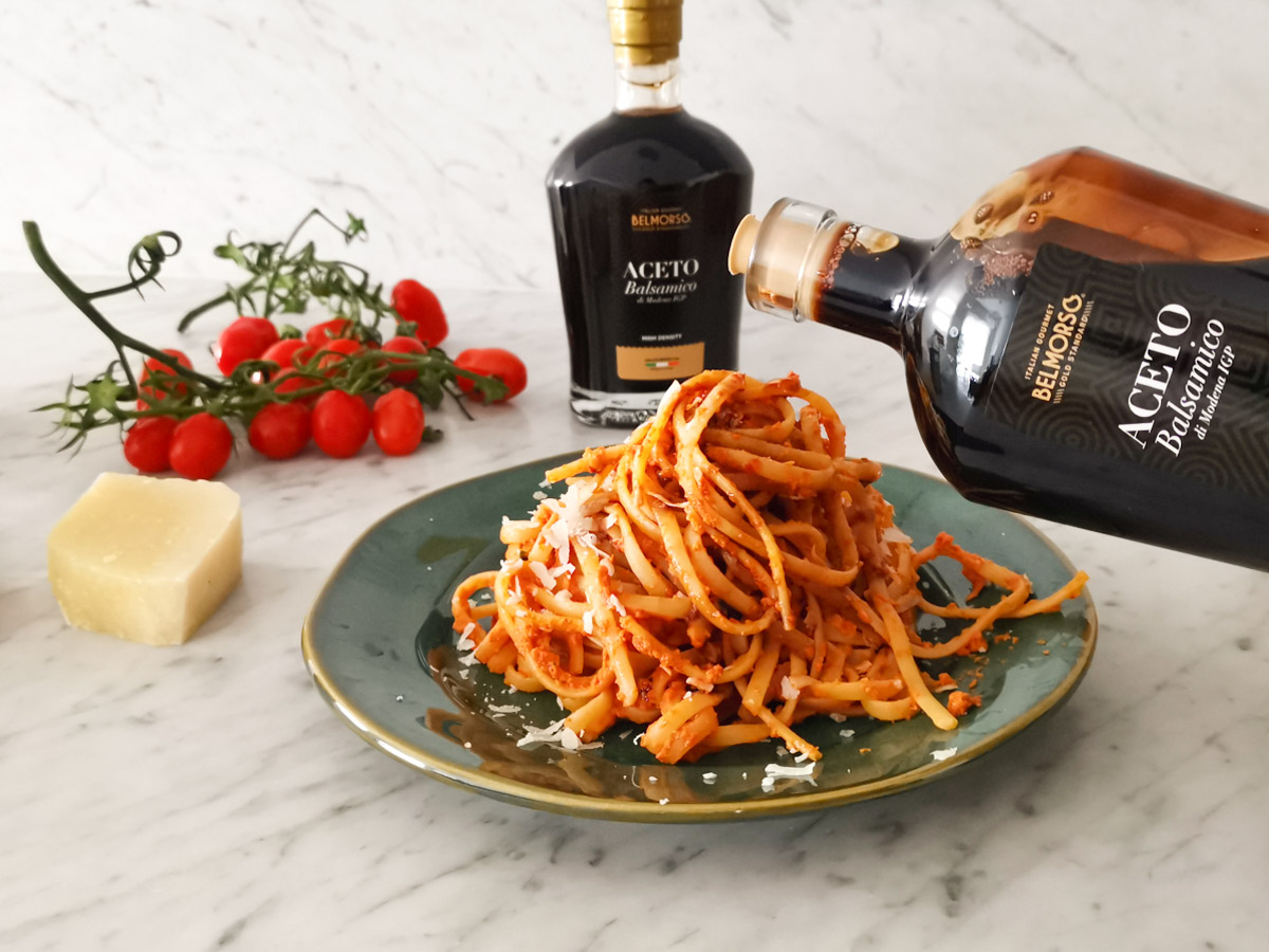 The classic basil pesto, or Pesto Genovese, doesn’t have any vinegar, neither regular nor balsamic. However, red pesto that uses sun dried tomatoes, fresh tomatoes, or both (like the one we are making today), can benefit from a burst of flavour if you use a high quality Balsamic Vinegar of Modena like Belmorso IGP Balsamic Vinegar of Modena.