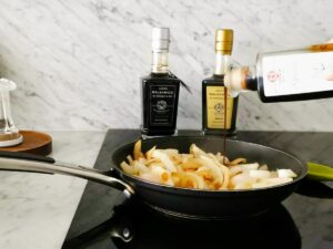 3. After a few minutes, add the 2 tablespoons of Balsamic vinegar of Modena. Mix and leave to caramelize over medium heat.