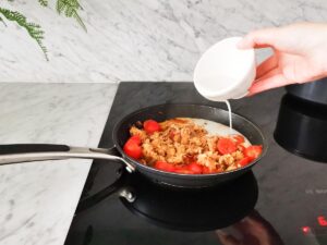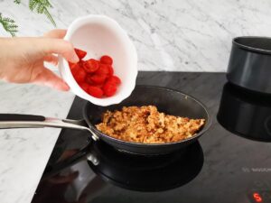 - Wash, cut and add your cherry tomatoes into the same pan.