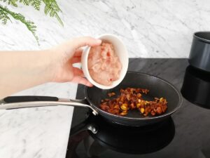 We are replacing the whole chicken breast with the minced chicken, because that’s what you would use to make a chicken ragu, inspired by the classic beef ragu or bolognese sauce.