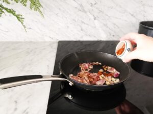 - Sauté the garlic and onion in a pan with Belmorso Extra Virgin Olive Oil.