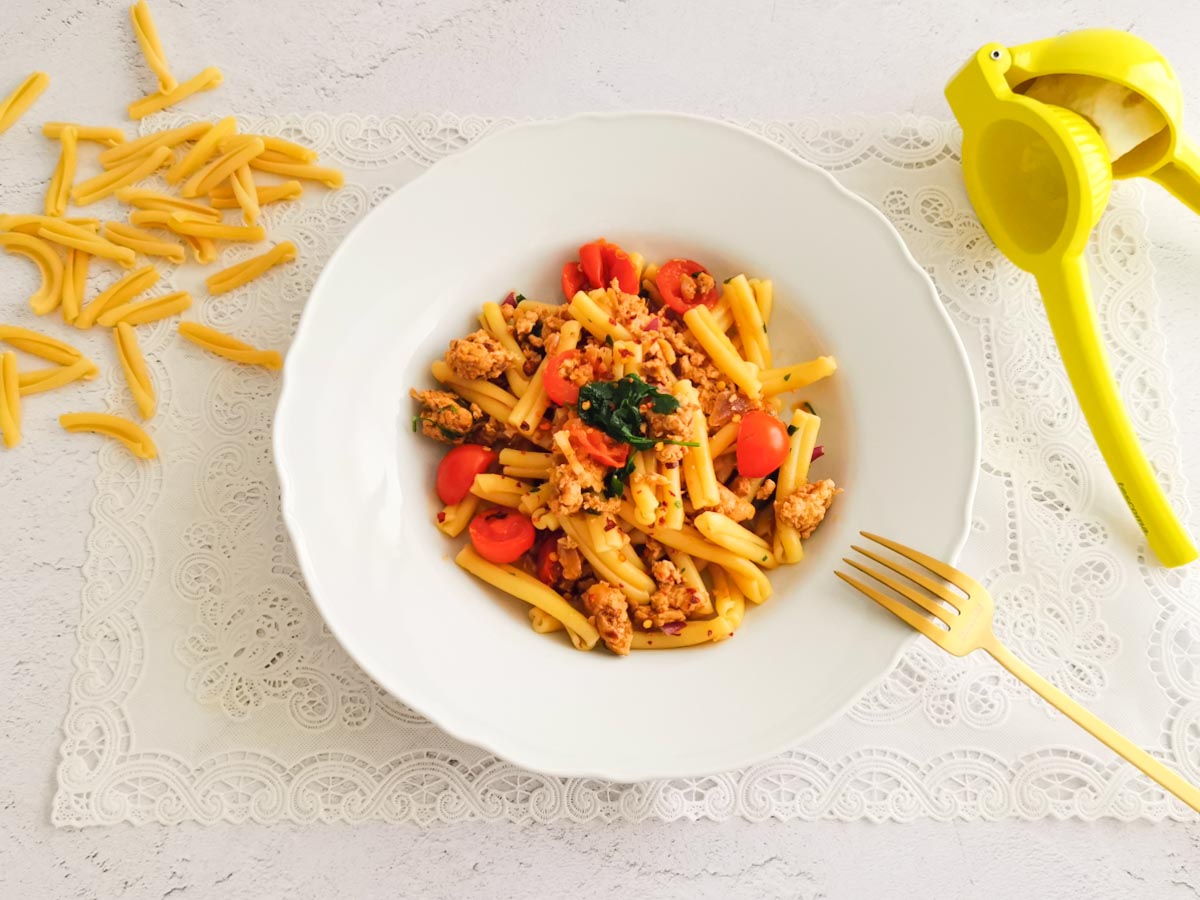 Since Harissa Paste happens to be a product of Tunisia, another Arab country, you can see how this pasta almost has an Arabic feel to it, which marries well with the Casarecce shape from Sicily.