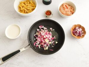 - Set aside 1/3 of the onion so you can add it raw at the end when you are serving your pasta. You can skip this step if you don't like eating raw onion. In that case, cook the entire onion.