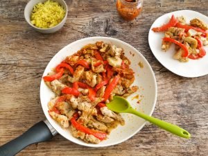 This spicy chicken stir fry pairs incredibly well with a busy work day. It’s like we are taking our beloved soffritto and turning into a full on meal. What to expect: Crunchy and soft vegetables,