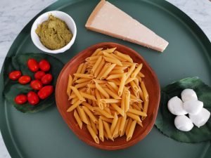 Pesto Pasta for Summer featuring pesto, cherry tomatoes and mini mozzarella Pesto pasta it’s and Italian classic, but today we are going to make a pesto pasta salad which is perfect for Summer lunch, dinner,