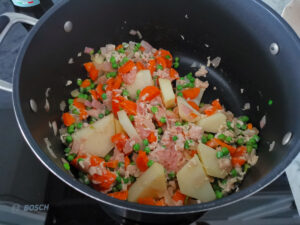 - After 7 minutes, add your chicken mince and one more tablespoon EVOO. Mix well, lower the heat further, and let it cook for another 5 to 10 minutes. Remember to mix from time to time.