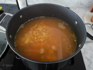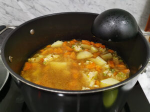 - Season and mix. Lower the heat, cover with the lid, and let the vegetable soup cook for 30 minutes.