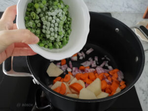 - Add them all together in a pot, with the frozen peas, and two tablespoons of Belmorso EVOO. I suggest you leave Novello for drizzling at the end.