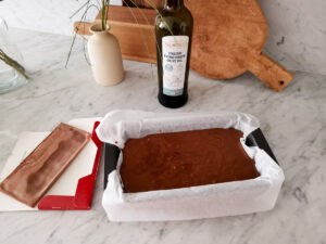 - Layer some baking paper on your baking dish, ideally a pound cake dish, and drizzle some EVOO.