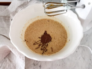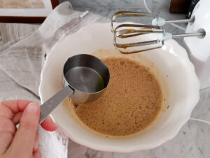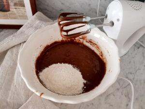 - Add 1/3 of the dry mixture into the liquid mixture and beat with the electric mixer. Repeat until you have used all the dry mixture.