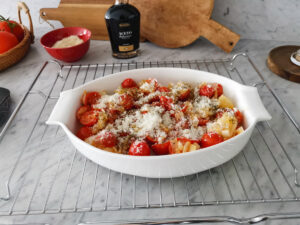 - Sprinkle the Italian mixed herbs, drizzle a little Belmorso EVOO, top with the pre-grated parmesan cheese, and bake for another 10 minutes at the top of your oven.