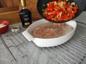 - Take the tomatoes and onions off the hob, and spread them on top of the chicken breasts.