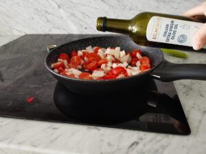 - Sauté the onion and cherry tomatoes in Belmorso EVOO for about 10 minutes. Lower the heat, and season with salt and pepper.