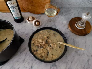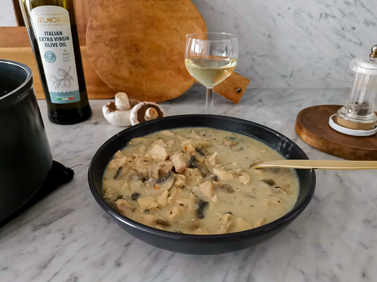 Let’s make this easy one pot chicken and mushrooms, and while it simmers you can go about doing your chores, or sit back and relax with your wine.