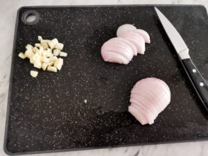 - Peel and cut the garlic and onion.