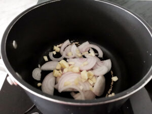 - Sauté both garlic and onion in EVOO (1 tbsp) in your pot.