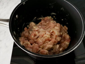 - Add the chicken pieces into the same pot and another tablespoon EVOO. Leave to sauté for 5 minutes or so. Turn it from time to time so it goldens evenly.