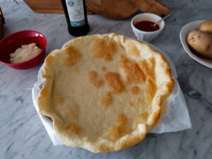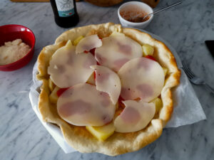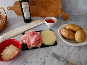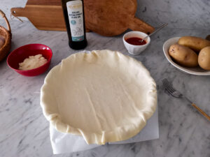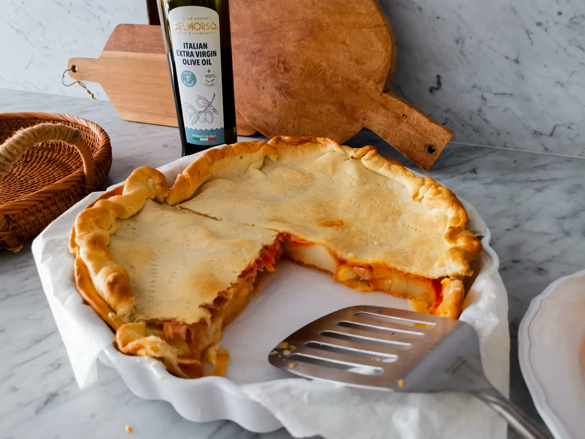 Torta di prosciutto e formaggio con patate is the general Italian name for this pie. However, different regions may call it in different ways. For example, in Sicily we call it scacciata di patate con prosciutto e formaggio. But if we were making scacciata pastry, we would be making our dough from scratch. And that dough has a more bready pizza consistency than in this recipe.