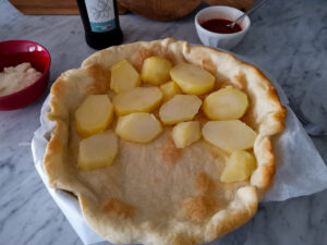 - Peel and slice your potatoes, and add one layer on top of the pie crust you just baked.