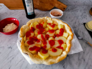 The beauty of this pie recipe is that you can quickly change it by using a semi soft regional cheese. We are using provola, although I also suggest scamorza, because they have a great in between consistency and give a lot of flavour. If you can’t find those, a combination of hard mozzarella and Parmesan are fine. But feel free to experiment with other cheeses that you enjoy.