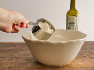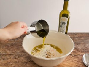 - Slowly add the extra virgin olive oil into the dry mixture, and mix well.