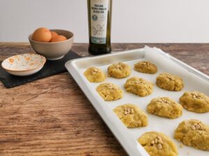 Today, we are baking these scrumptious Italian olive oil biscuits with pine nuts. Said alone, it already makes your mouth water, doesn’t it?