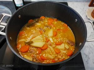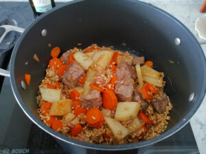 - Add the barley to the pot, mix and let it cook for 5 minutes before adding in the bowl of stock and more water to cover all the ingredients.
