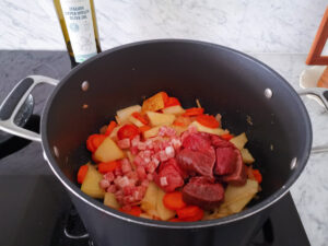 - Then, add the bacon and beef pieces, mix and let them sauté for another 10 minutes.