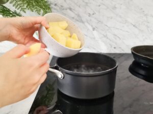 - I am using some brussels sprouts we cooked the day before, but if you don't have any pre-cooked, go ahead and wash them and boil them along your potatoes.