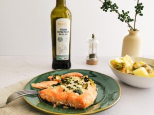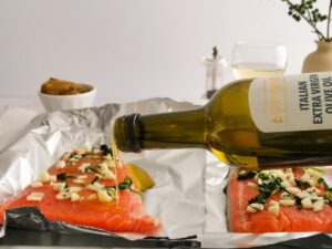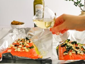 The key ingredients are the salmon of course, the extra virgin olive oil, and the white wine. You should use high quality oil and wine to get the best results. I suggest Belmorso EVOO or Novello if in season (you can check here).
