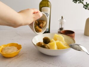 - To make the salad simply add the potatoes and brussels sprouts in a bowl, season with salt and pepper, drizzle with Belmorso EVOO and add two teaspoons mayonnaise.