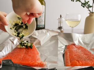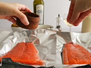 Here’s our Italian poached salmon in the oven. As you can see it features very few ingredients, making it a very quick and healthy recipe to make.