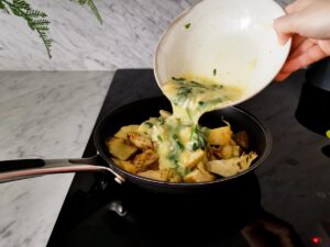 - Now, you can add the artichokes and eggs mixture you cooked in the pan. By now, it should be a little cooler and also firmer.
