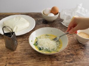 - Add 1 tablespoon grated pecorino cheese and beat well.