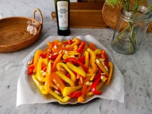 The original recipe calls for roasting the peppers on the barbecue. My mum would cook them whole with the skin on, on the traditional Italian barbecue, and then put them in a brown bag for an hr. That step allows the skin to soften, thanks to the heat and moisture forming inside the bag. After that, she would let them cool down, and peel them. Later, she would cut them, deseed them, and slice them. The final step would consist in marinating them with extra virgin olive oil, and chopped garlic. The peppers cooked that way can be eaten straight away, but they become more delicious the longer you let them marinate in the fridge. They must be consumed withing 5 days though.