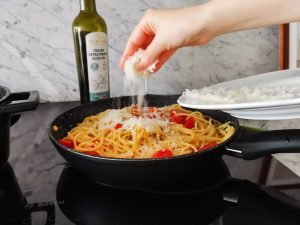 - Take the pasta off the heat, and serve with some grated parmesan.
