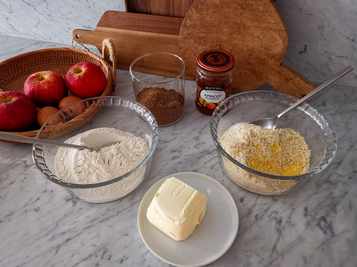 Have you ever made or tried the Sbrisolona cake from Mantua? It’s an interesting one featuring regular flour, polenta flour and ground almonds. It has a crumbly texture on top and it usually comes with no filling. However, we are making our own version with caramelized apples.