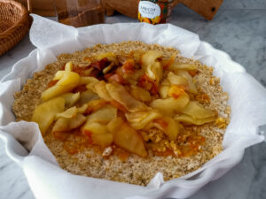 - Once the apples have cooled, add them on top of the dough. Keep the apples towards the centre.
