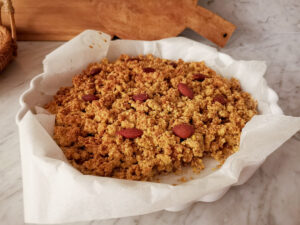 - Top with the crumbled topping of the cake. This time you want to add it into crumbles, so that texture is emphasized even more. You can use your clean hands to achieve that.